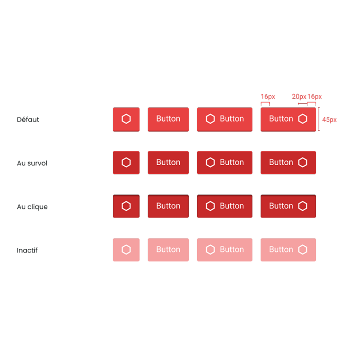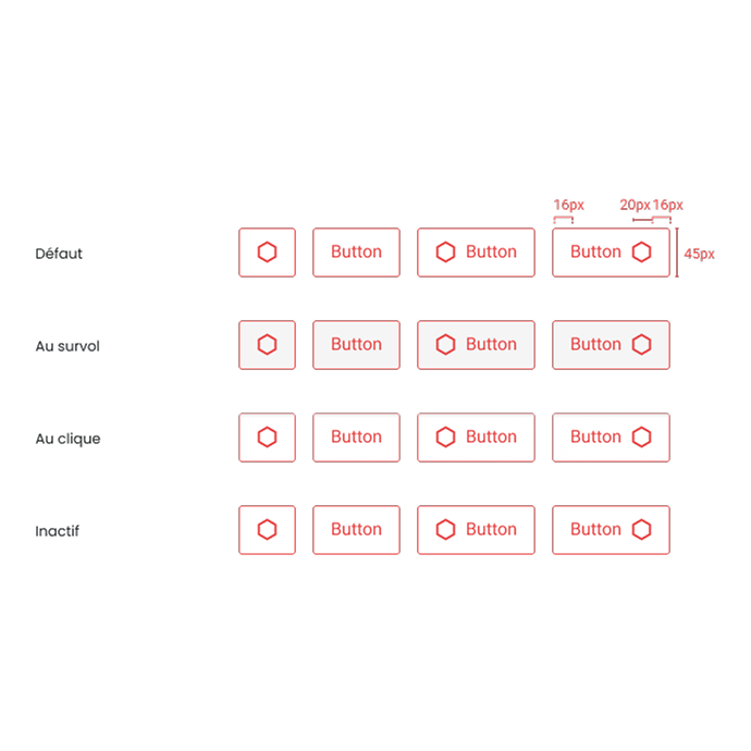 L’interface distingue deux styles de boutons afin de hiérarchiser les actions : les boutons pleins pour les actions principales, et les boutons à bordure pour les actions secondaires, plus discrètes.