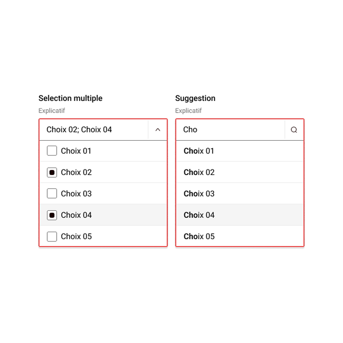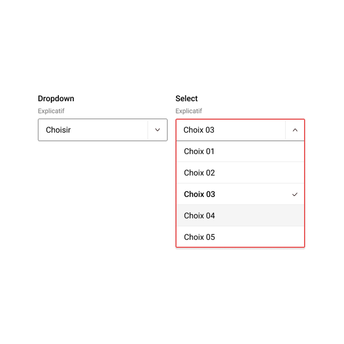 Les composants de sélection reposent sur une logique visuelle cohérente et des états explicites, facilitant la compréhension des interactions tout en maintenant une bonne accessibilité.