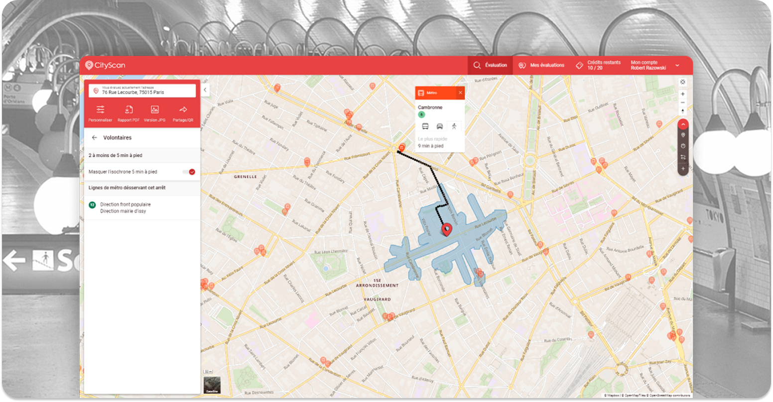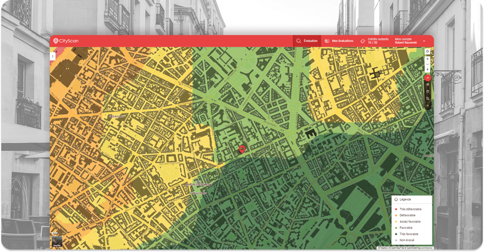 CityScan rend accessibles un large volume de données sur l’environnement d’un bien, avec des explications synthétiques dans le cartouche à gauche et une illustration directe sur la carte centrale, pour une lecture rapide et contextualisée.