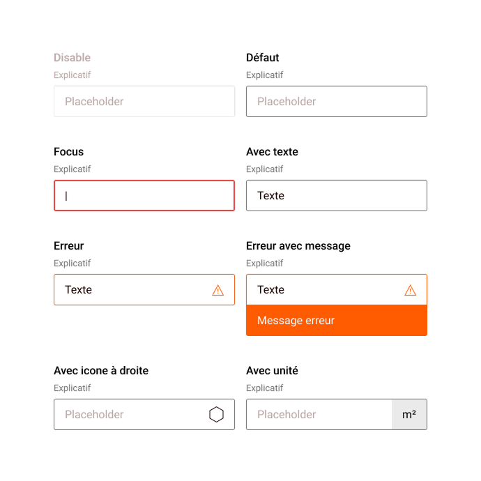 Les champs de saisie privilégient une approche sobre et fonctionnelle, avec des états clairement identifiés (actif, focus, invalide). Les erreurs sont signalées en orange, afin de préserver la lisibilité tout en respectant l’identité graphique de CityScan.