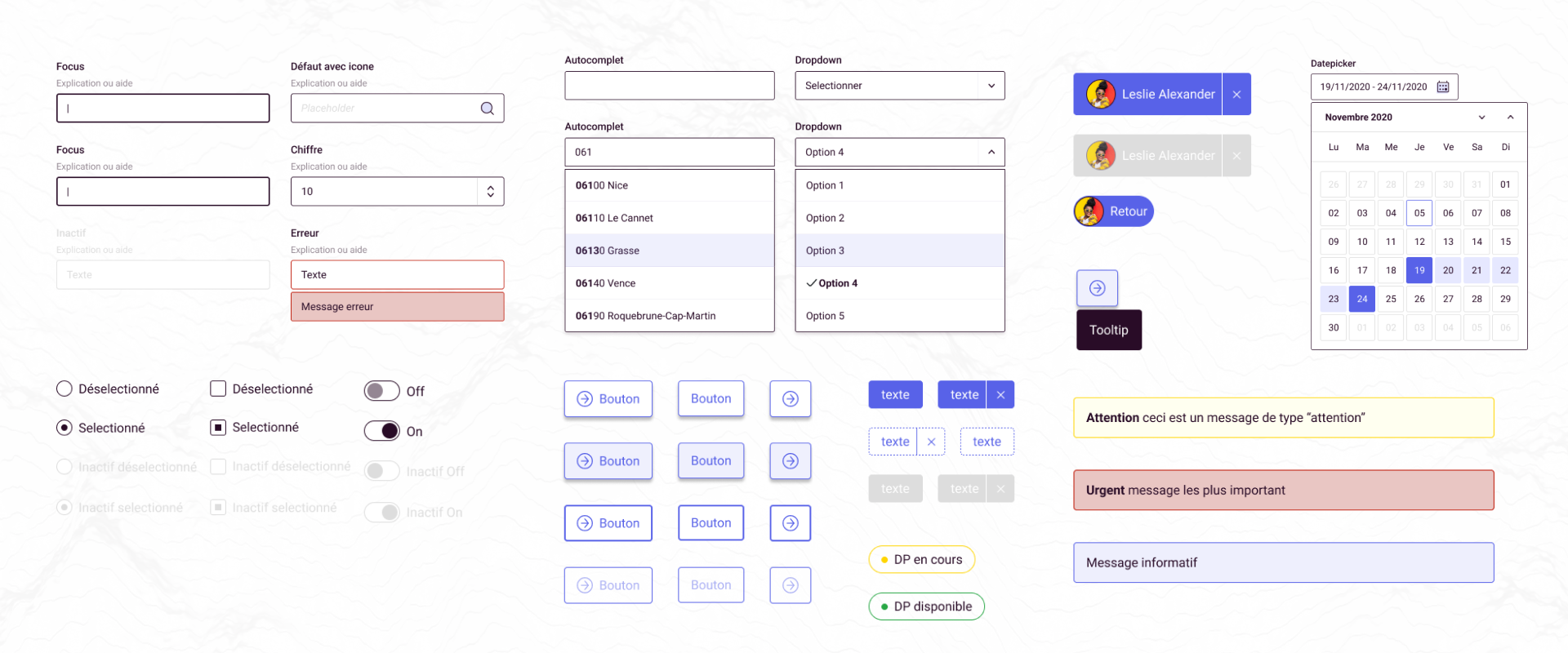 Le datepicker prend en charge la sélection d’une date ou d’une plage, avec une interface simple et accessible. Il permet la saisie directe ou l’ouverture d’un calendrier, avec une gestion claire des états (focus, sélection, désactivation) et des validations intégrées.